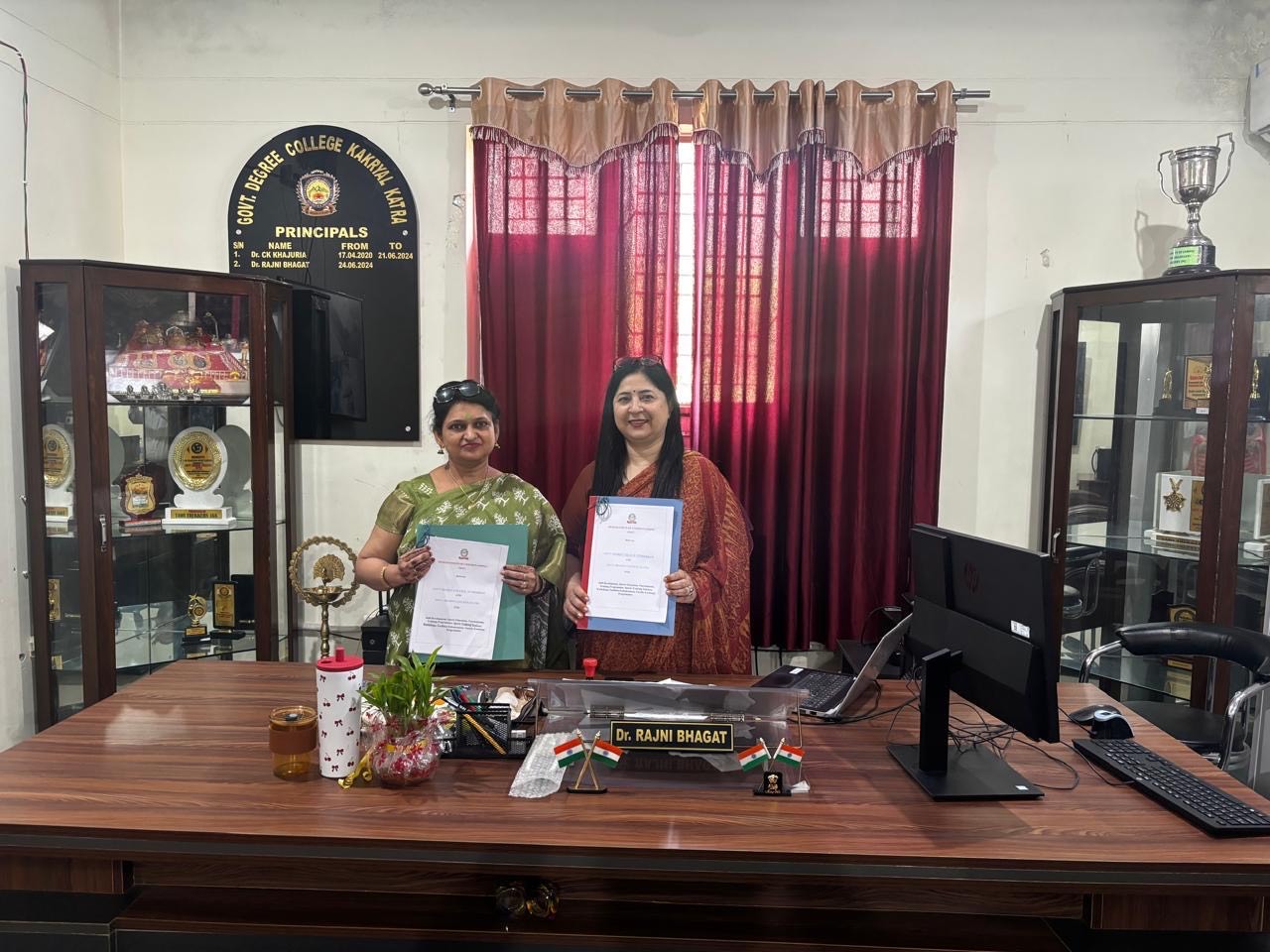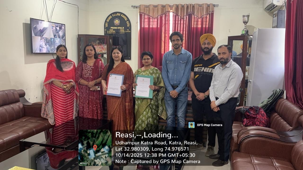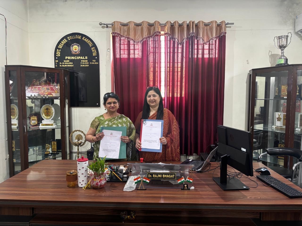 Government Degree College Kakryal (Katra) and Government Degree College Sunderbani (Rajouri) to formalize cooperation in areas of academic affairs, sports activities, skill enhancement, and compliance/preparation for NAAC (National Assessment and Accreditation Council) signed a Memorandum of Understanding (MoU) on 14-10-2025. The MoU aims to improve academic quality by sharing faculty expertise, joint workshops, research collaborations, and academic exchange.Further, to enhance sports infrastructure and encourage intercollege sports events, training, and talent development. It also aims to build student and staff skills via workshop certificate courses, soft skills training, vocational/skill‐based programs. It will also helps to prepare both institutions for NAAC accreditation by strengthening their IQACs, ensuring compliance with NAAC criteria, internal quality assurance, documentation, student feedback etc. The MoU was signed by Dr. Rajni Bhagat, Principal, GDC Kakryal and Dr. VandanaVerma, Principal, GDC Sunderbani. The faculty members who were present during the signing ceremony include Dr. SajadAhmad, Prof. Shikha Bhasin, Dr. Usha Sharma and Prof. Mohd. Younus Saleem. This MoU between GDC Kakryal Katra and GDC Sunderbani Rajouri in the domains of academic collaboration, sports, skill development, and NAAC can lead to substantial benefits for students, faculty, and the institutions themselves. With careful implementation, monitoring, and mutual commitment, this partnership can enhance quality, reputation, and student outcomes in both colleges.