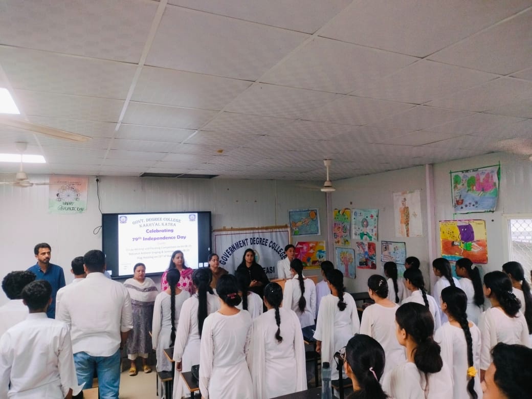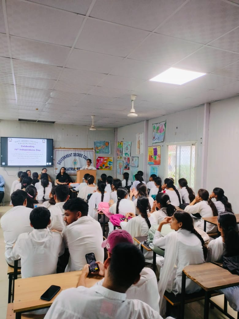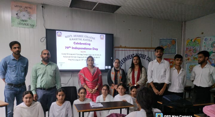 Govt. Degree College Katra celebrated the 79th Independence Day with great patriotic fervor and enthusiasm.The celebrations commenced with the flag hoisting ceremony at 8:55 a.m. followed by an inspiring address by the worthy Principal, Dr. Rajni Bhagat. The programme began with a lamp-lighting ceremony, after which Principal Dr. Bhagat addressed the gathering, highlighting the significance of the day and paying tribute to the sacrifices of the freedom fighters. Two students, Shivani Charak of B.A Sem III and Sushma Devi B.A. Sem. II delivered speeches on the supreme sacrifices made by India’s freedom fighters. A certificate and memento distribution ceremony was also held, wherein participants and position holders were felicitated for their achievements. Dr. Usha Sharmapresented the NSS Annual Report, outlining the activities and accomplishments of the unit from the month of January 2025 to till date. The event was anchored by students Neha Kumari and Riya Bazal. The celebrations witnessed enthusiastic participation from students of all semesters, along with faculty and non-teaching staff of the college. The programme concluded on a note of unity, pride, and respect for the nation.