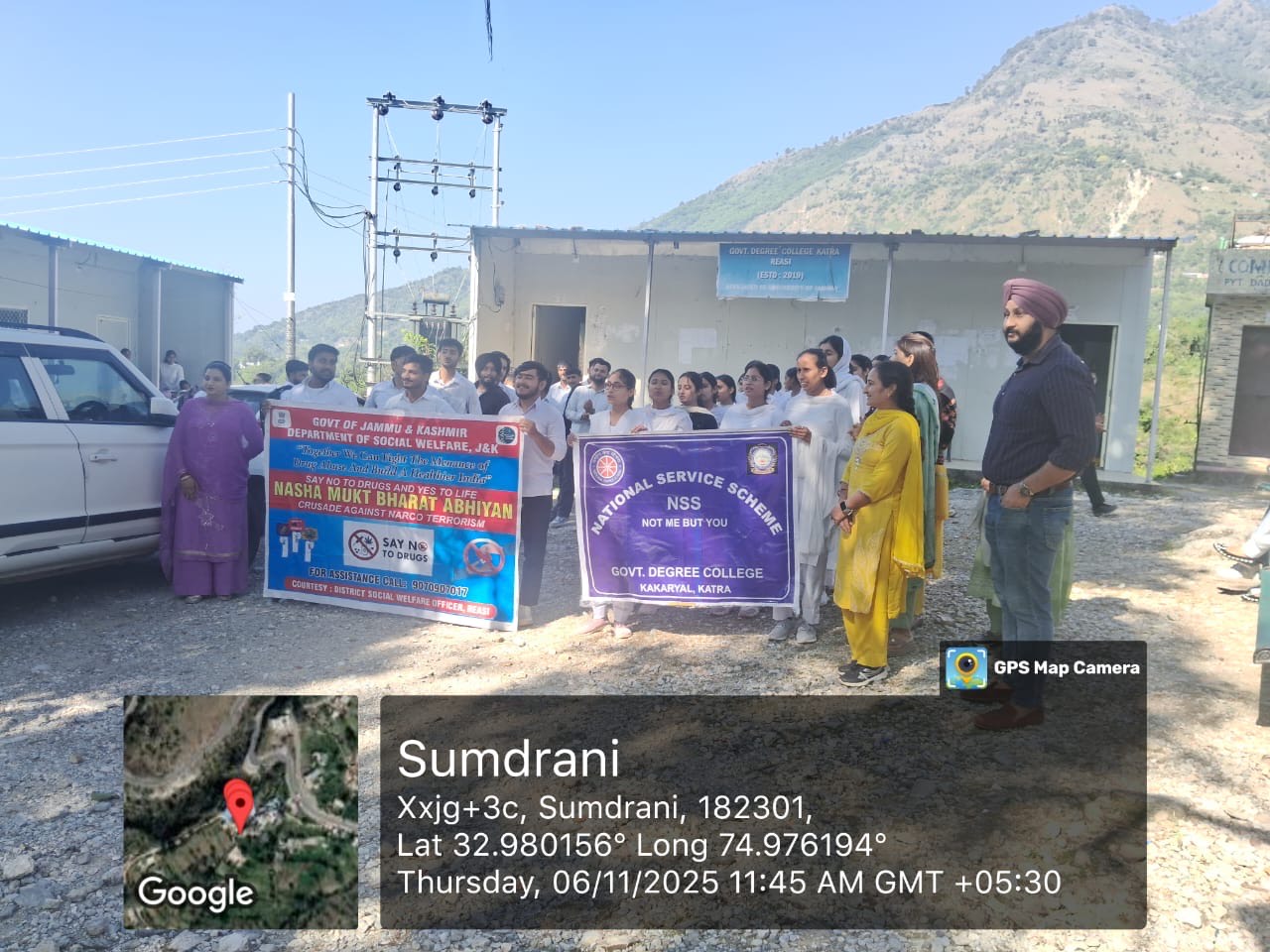The Government Degree College Kakryal, Katra in collaboration with the NSS Unit, NCORD Unit, and the Department of Social Welfare, District Reasi, organized a Pledge Ceremony and Awareness Rally under the banner of the Nasha Mukt Bharat Abhiyan on 6th of November 2025. The programme was organised under the able guidance of the principal of the college, Dr. Rajni Bhagat. The event aimed to spread awareness among students and the community about the harmful effects of drug abuse and to promote a drug-free society. The programme commenced with a pledge ceremony, where faculty members including Dr. Sajad Ahmad, Prof. Shikha Bhasin Dr. Harmeet singh, Dr. Harmeet Kour, Dr. Usha Sharma, NSS volunteers, and students took the Nasha Mukt Bharat pledge to stay away from drugs and to motivate others to do the same. Following the pledge, a rally was flagged off from the college campus. The participants, carrying placards ad banners with anti-drug slogans, marched raising slogans such as “Say No to Drugs”, “Youth for a Drug-Free India”, and “Healthy Mind, Healthy Nation.” The rally drew the attention of locals, creating a strong message against substance abuse. Overall, the programme was a great success, instilling a strong sense of responsibility among students and highlighting the importance of a collective stand against drug abuse for building a healthy and progressive nation.